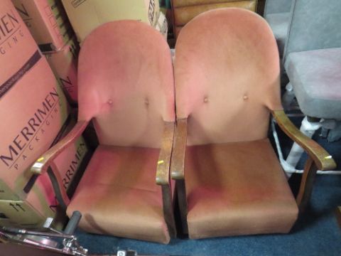 A PAIR OF VINTAGE OAK FRAMED UPHOLSTERED ARMCHAIRS