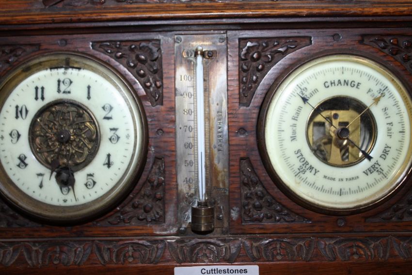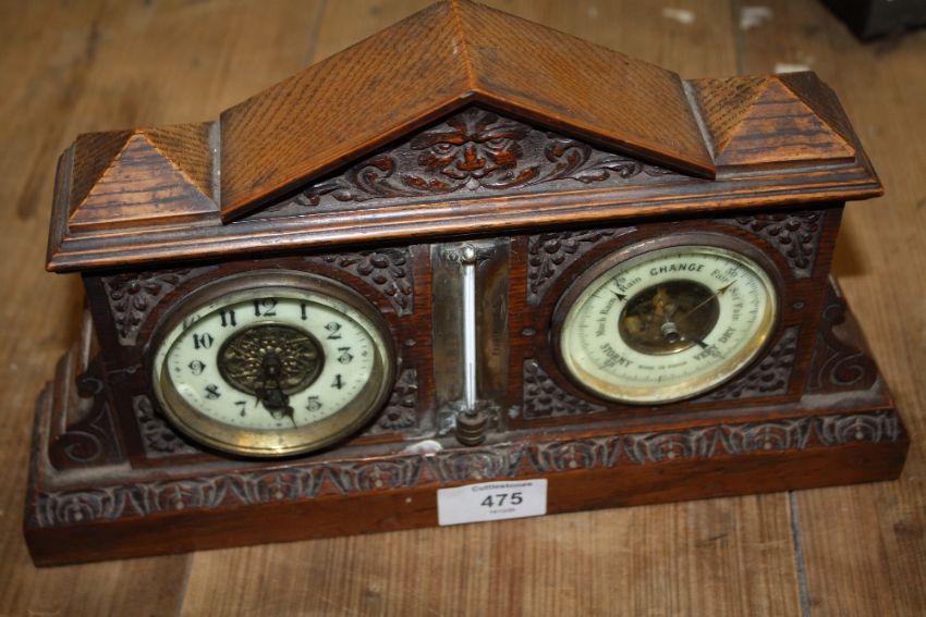 AN ANTIQUE CARVED OAK CASED COMBINATION DESKTOP CLOCK AND BAROMETER