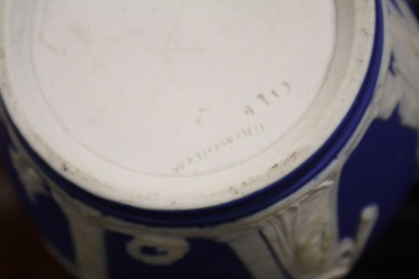 A TERRACOTTA WEDGWOOD JASPERWARE JUG, TOGETHER WITH A BLUE DIP JASPERWARE VASE (2)