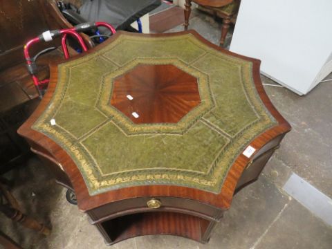 A REPRODUCTION MAHOGANY 'STAR' SHAPED LEATHER TOP DRUM STYLE TABLE H-81 CM DIA. 93 CM