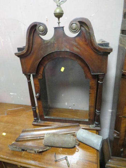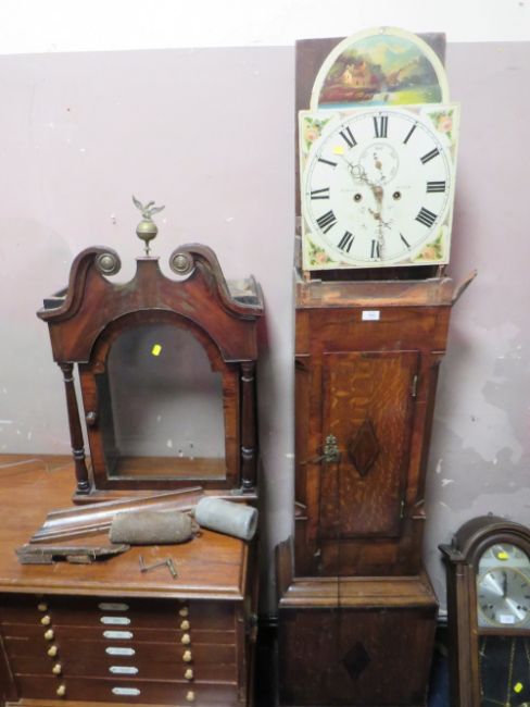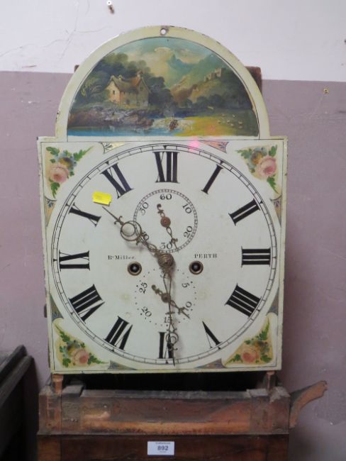 AN ANTIQUE OAK AND MAHOGANY LONGCASE CLOCK WITH ENAMEL DIAL R - MILLER - PERTH A/F TWIN WEIGHTS - PENDULUM
