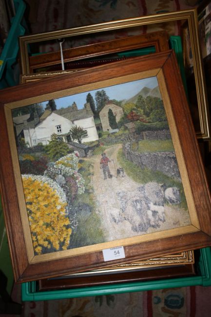 A BOX OF PICTURES AND PRINTS TO INCLUDE AN OIL ON BOARD OF A SHEPERD DRIVING SHEEP SIGNED FANNY