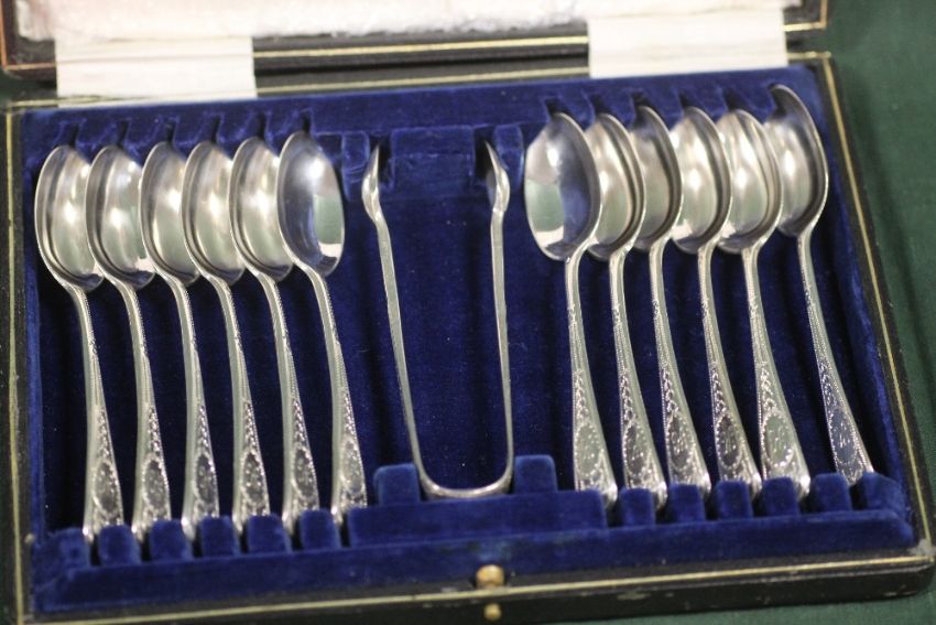 A CASED SET OF 12 HALLMARKED SILVER TEASPOONS AND TONGS