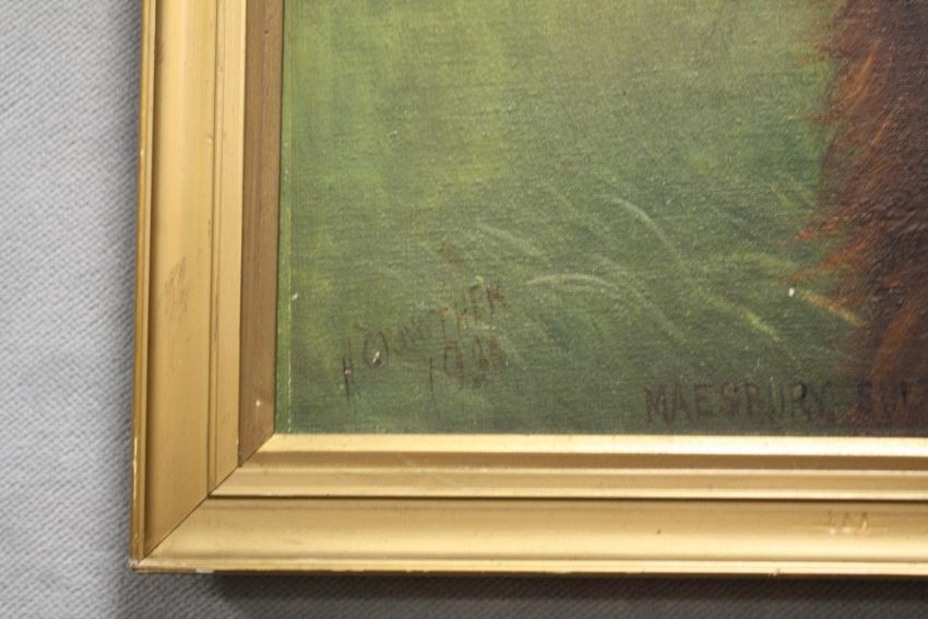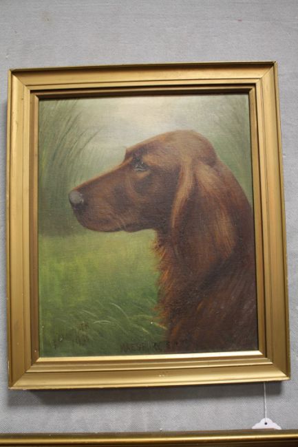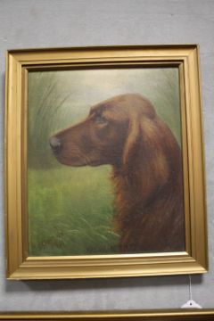 HENRY CROWTHER (1800-1900). Study of a Red Setter with long grasses in background 'Maesbury Sultan', signed and dated 1936 lower left, oil on canvas laid on board, framed, 29 x 24 cm