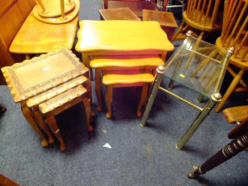 THREE ASSORTED NESTS OF TABLES AND TWO STOOLS