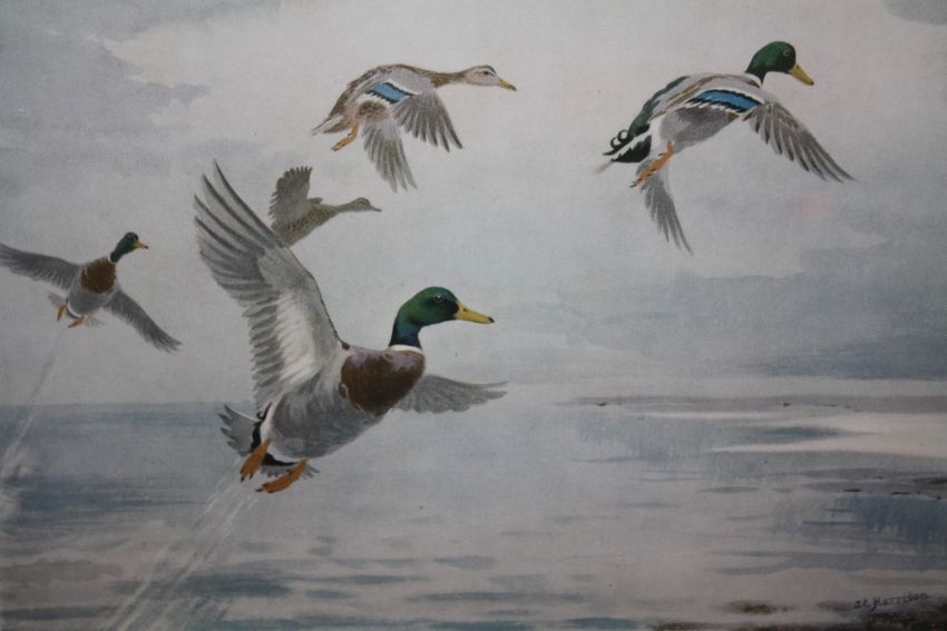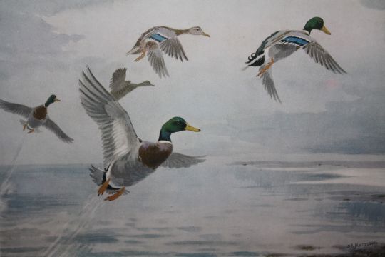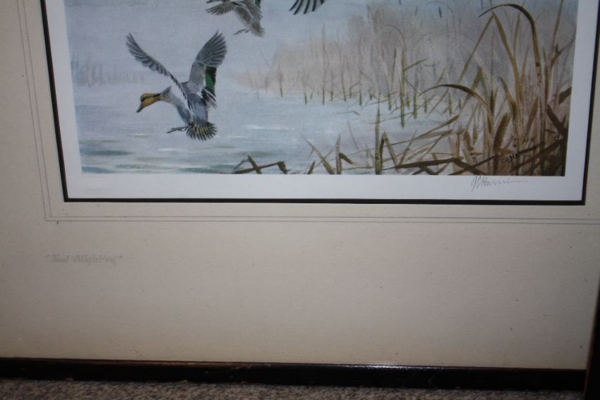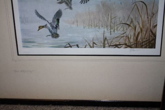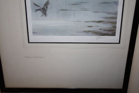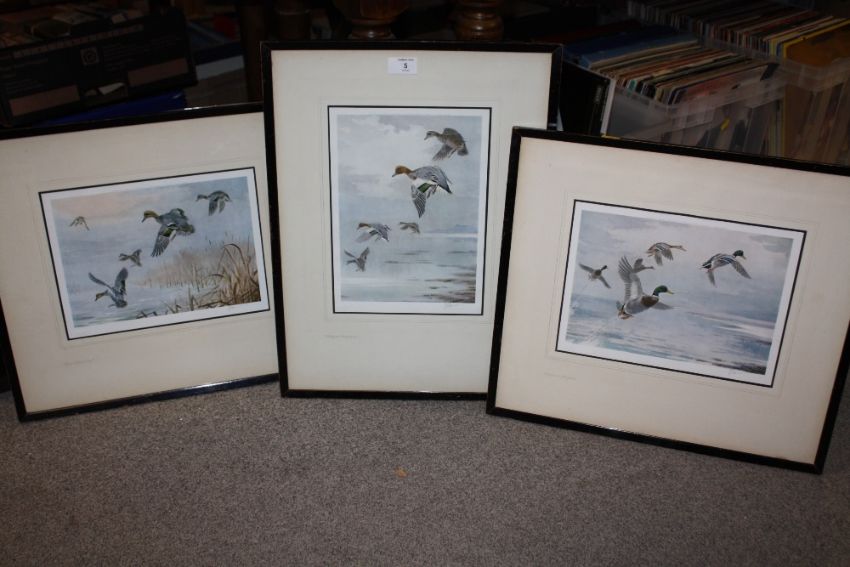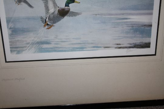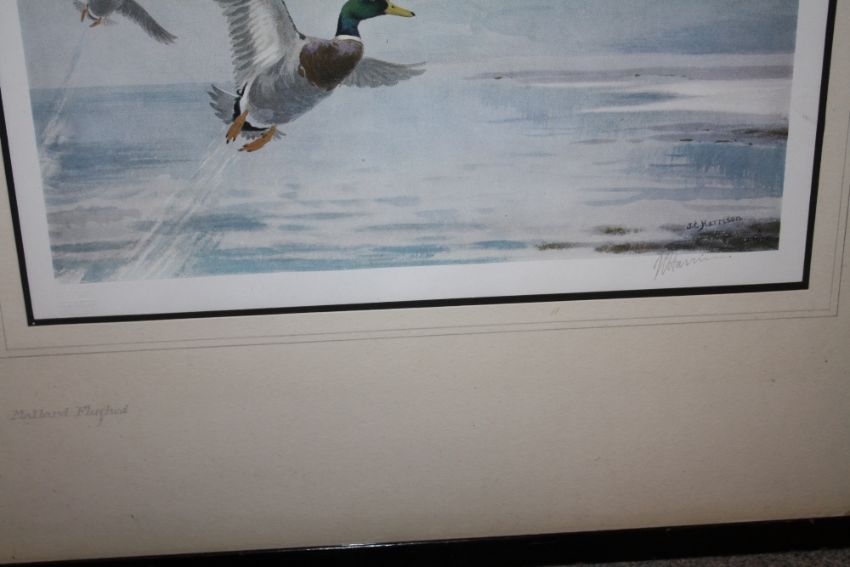 THREE FRAMED AND GLAZED SIGNED JOHN CYRILL HARRISON PRINTS WITH BLIND STAMPS DEPICTING DUCKS FLIGHT