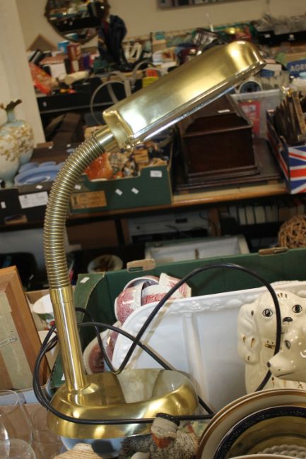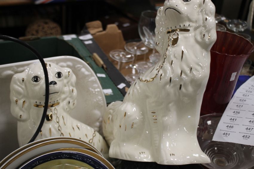 A TRAY OF SUNDRIES AND CERAMICS TO INCLUDE A READING LAMP, TWO STAFFORDSHIRE STYLE SPANIELS ETC.