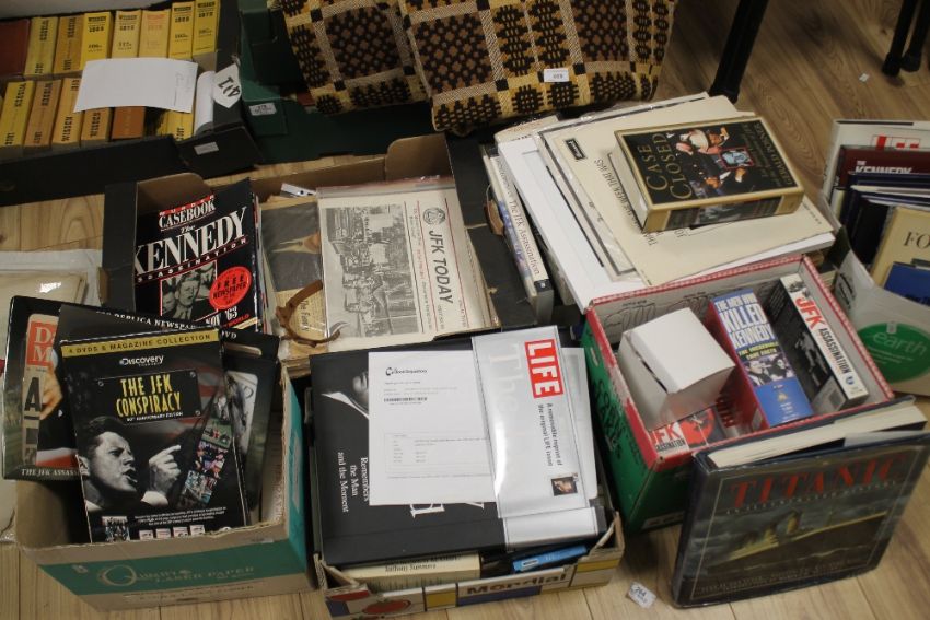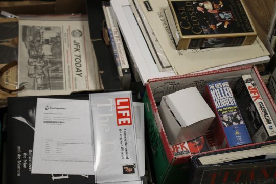 JOHN F. KENNEDY (JFK), A LARGE COLLECTION OF BOOKS AND MEMORABILIA to include original newspapers, facsimiles of documents, magazines, books including John Sparrow - 'After The Assassination', a framed photograph, two LP records, a boxed mug, videos etc.