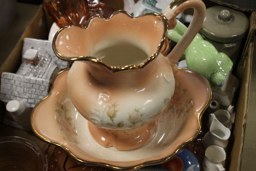 A TRAY OF CERAMICS TO INCLUDE A SMALL JUG AND BOWL SET (TRAY NOT INCLUDED)