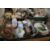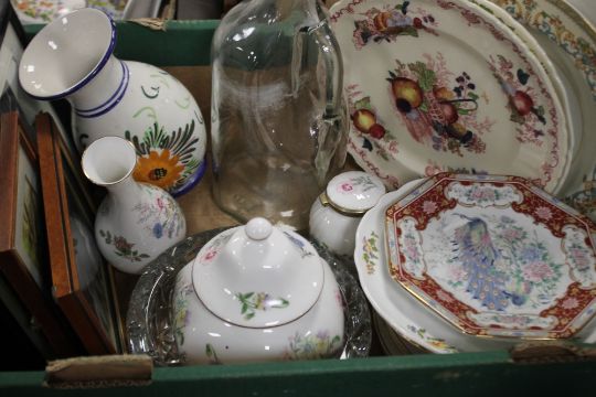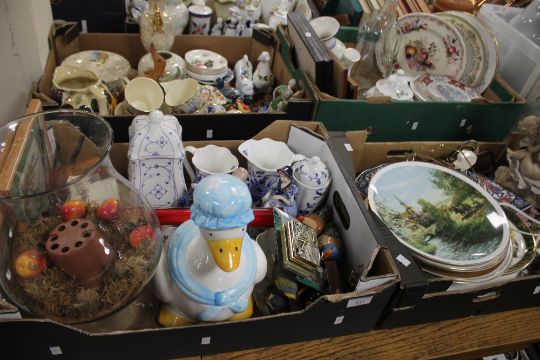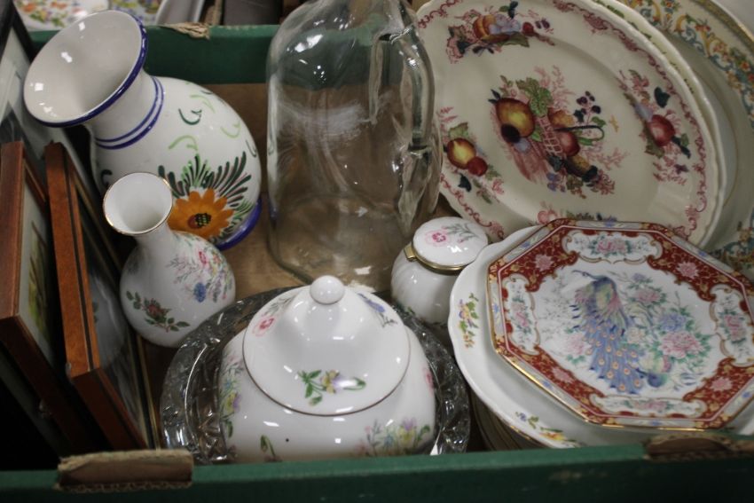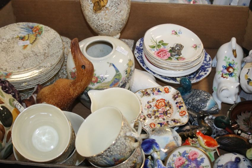 FOUR TRAYS OF CERAMICS TO INCLUDE CONTINENTAL STYLE FIGURES, A FIGURATIVE LAMP ETC.