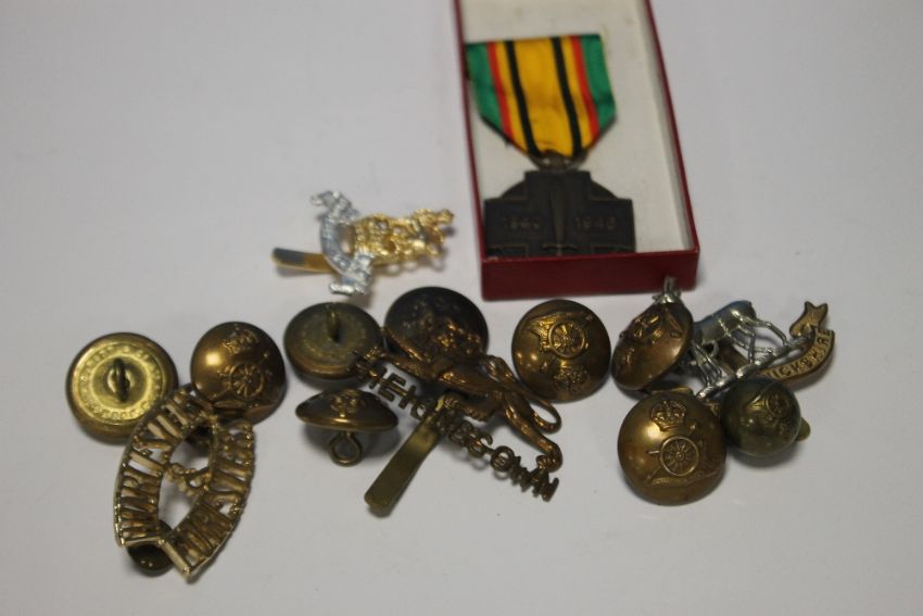 A BELGIUM MILITARY COMBATANTS CROSS MEDAL 1940-45 and a quantity of military badges and buttons.