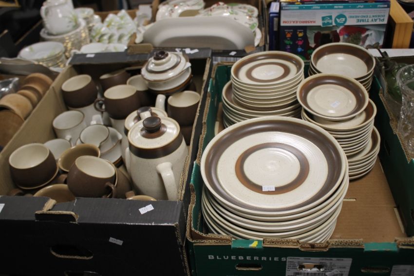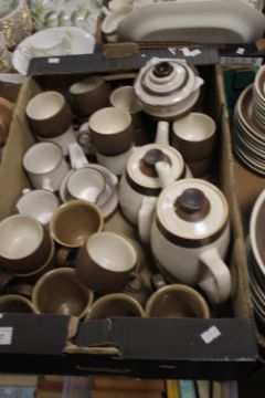 TWO TRAYS OF DENBY AND SIMILAR STYLE TEA & DINNERWARE (TRAYS NOT INCLUDED)