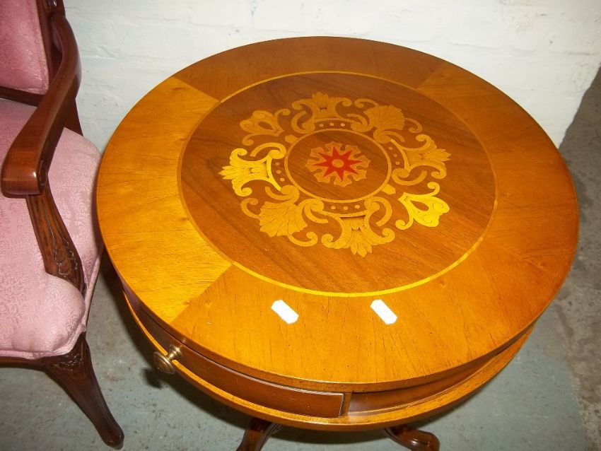 A DRUM TABLE, CHAIR AND ANOTHER TABLE (3)