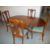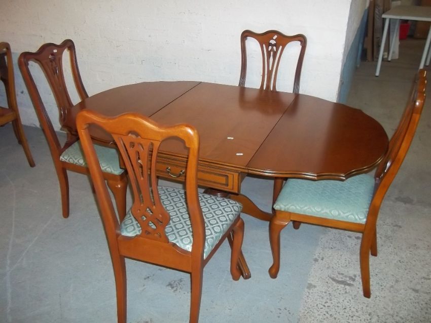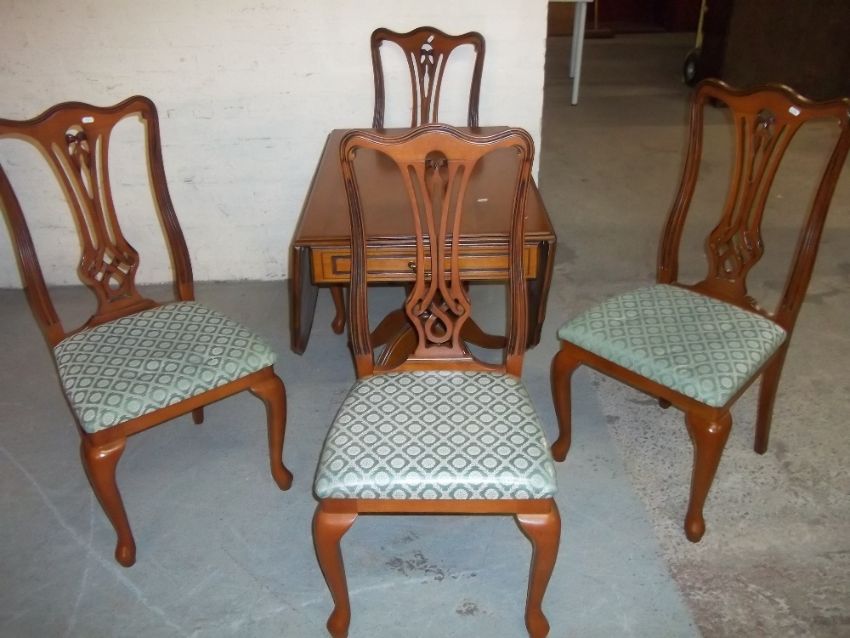 A REPRODUCTION DROP LEAF PEDESTAL DINING TABLE WITH FOUR CHAIRS WITH CABRIOLE LEGS
