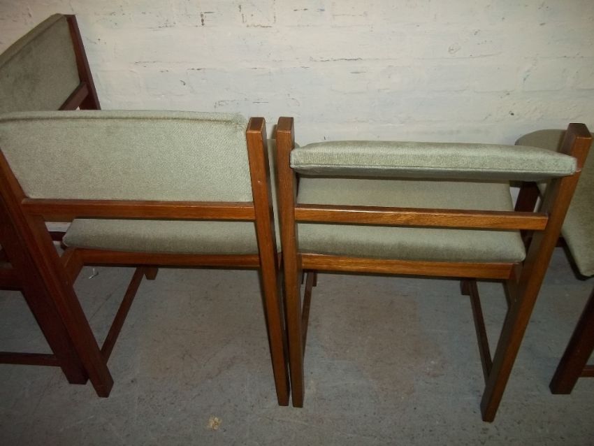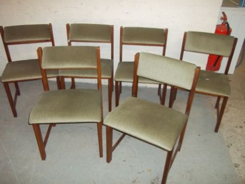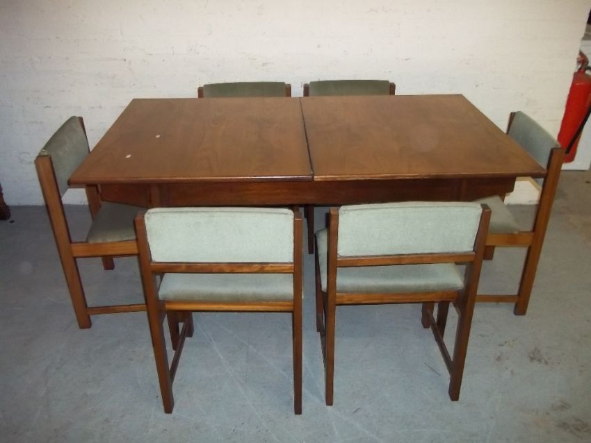 A RETRO TEAK EXTENDING DINING TABLE AND SIX SWIVEL BACKED DINING CHAIRS