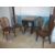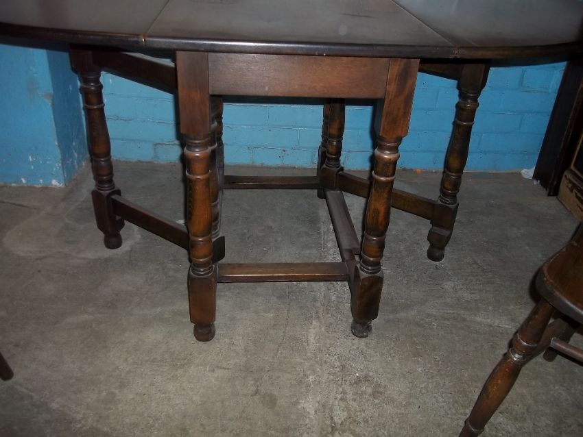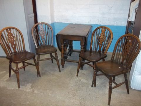 AN ANTIQUE DROP LEAF OAK DINING TABLE AND FOUR WHEEL BACKED CHAIRS