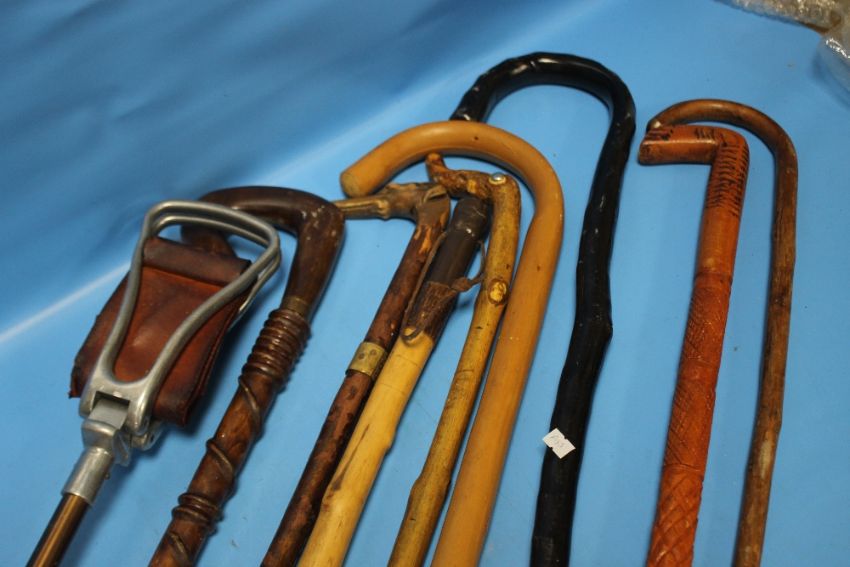 A COLLECTION OF ASSORTED WALKING STICKS AND A SHOOTING STICK