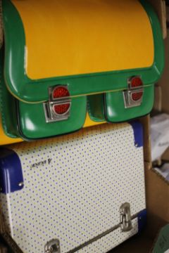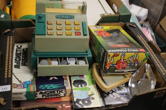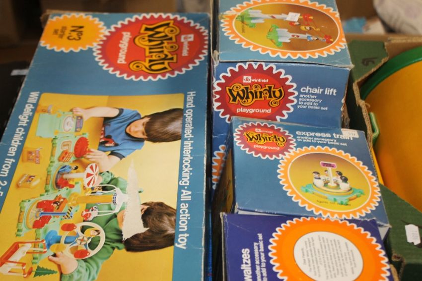 ,FOUR BOXED WINFIELD WHIRLY TOYS, to include number three Playground Starter Set, chair lift, express train and waltzes together with two boxed Fisher Price Colour with Yarn Art and Craft sets A CHILD'S COLOURFUL SATCHEL / BRIEFCASE AS NEW, and a Baganda case, and A BOXED VINTAGE ETCH A SKETCH DRAWING TOY, GAF VIEW MASTER AND SLIDES, INGHAM DAY MAGNETIC FISHING SET, together with an unboxed 1970s Maxicash child's cash till with coins, unboxed 1970s Casdon weighing scales, Reeves painting ans plasticene sets