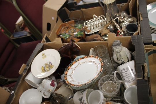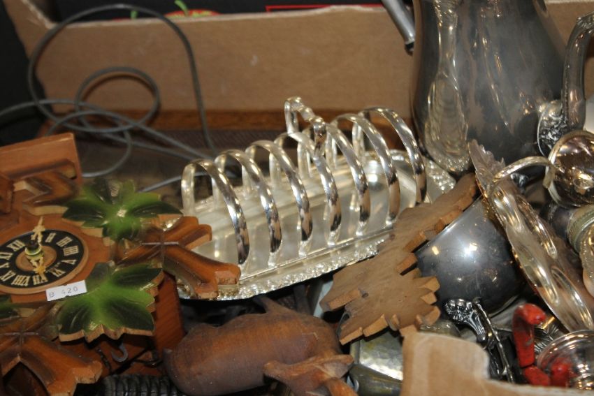 TWO TRAYS OF CERAMICS, METALWARE ETC. (TRAYS NOT INCLUDED)