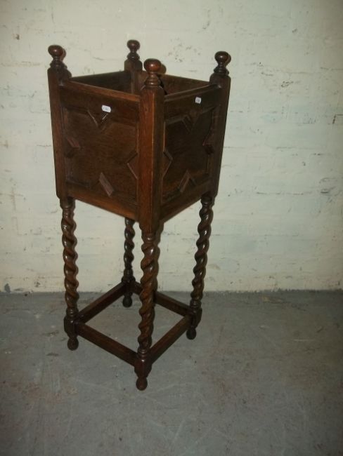 AN ANTIQUE OAK PLANT STAND WITH BARLEY TWIST DETAIL