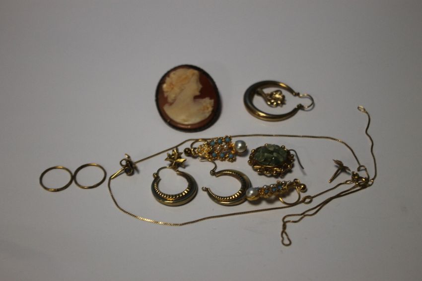 A QUANTITY OF GOLD AND YELLOW METAL JEWELLERY TO INCLUDE A CAMEO BROOCH