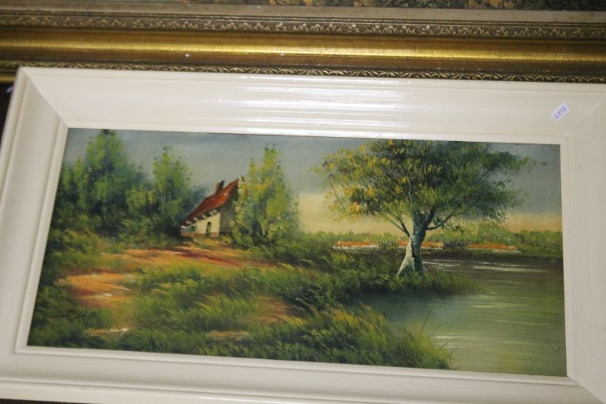 A FRAMED LANDSCAPE PRINT TOGETHER WITH TWO OIL PAINTINGS OF RURAL SCENES