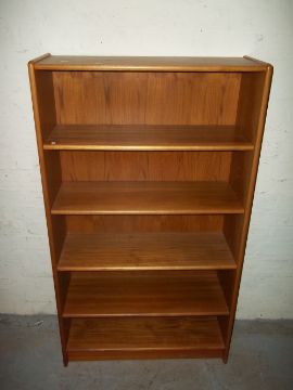 A RETRO TEAK BOOKSHELF, A MILKING STOOL AND A TOOL CABINET