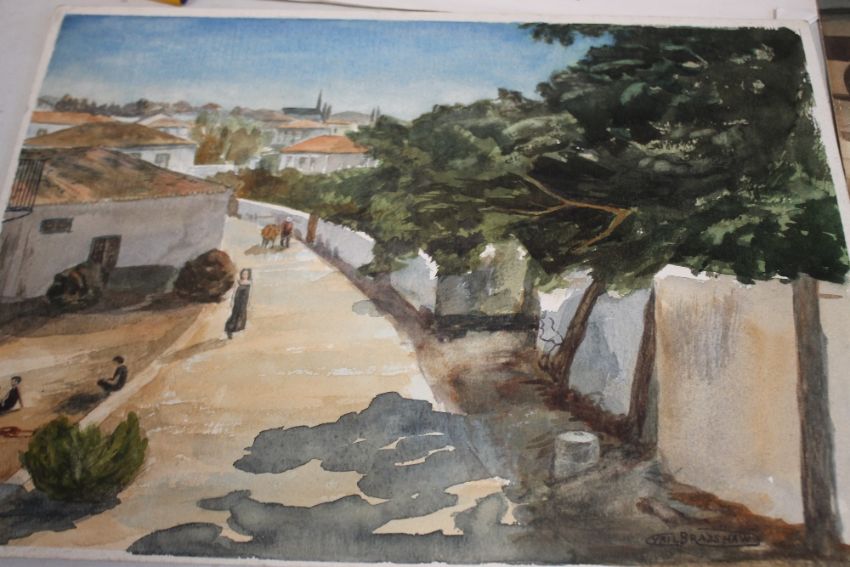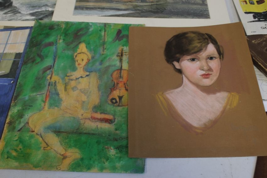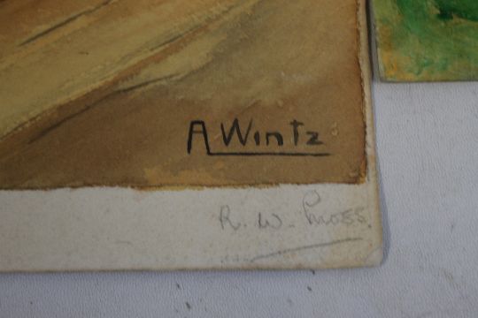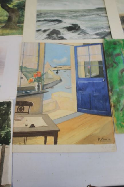 ORIGINAL ARTWORK - OIL PAINTINGS, WATERCOLOURS ETC., to include a watercolour of a blue door showing signature R. Wintz with a pencilled signature under R. W. Moss, cottages signed L. Wilkins, a floral study signed A. Gurteiger (?), a continental view signed Cyril Bradshaw, a pierrot signed De Courcey, a seascape watercolour signed T. Castle and amateur paintings of Stafford Park by F. Guest 1971, etc.