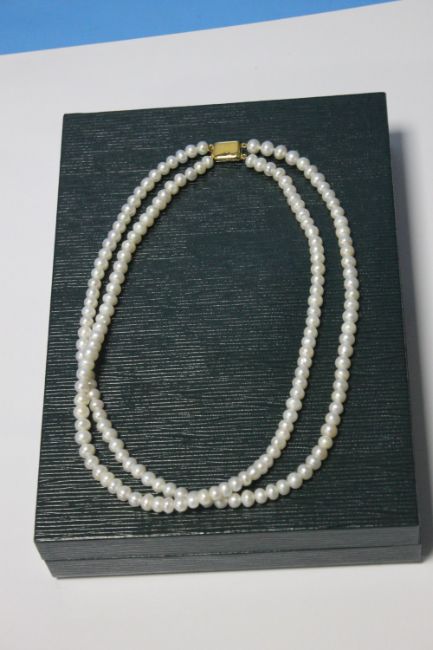 A TWO STRAND ERNEST JONES PEARL NECKLACE WITH A 9 CT GOLD CLASP