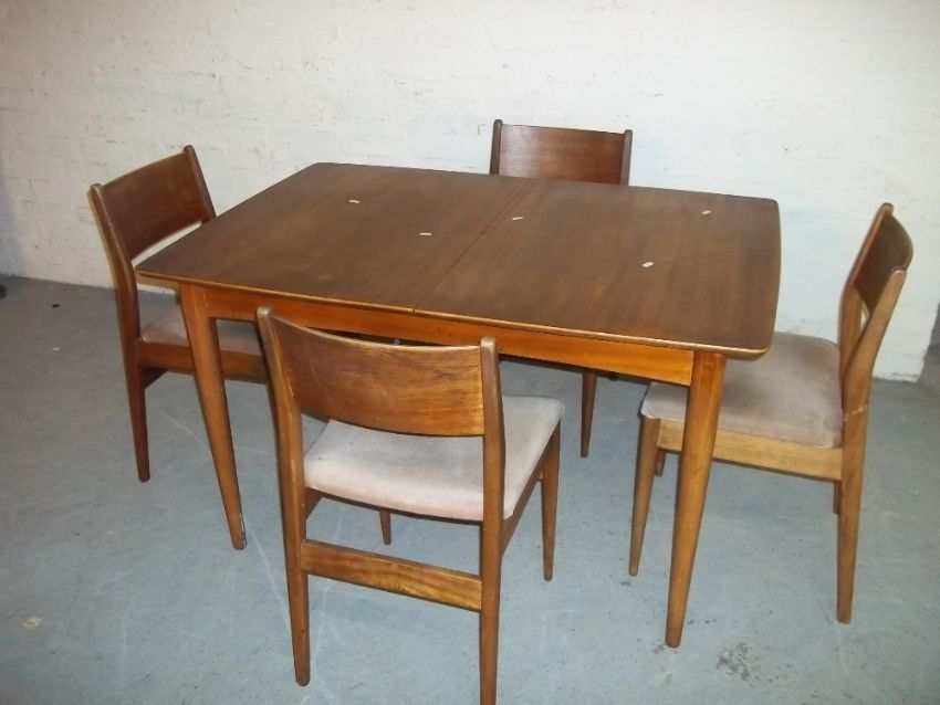 A VINTAGE TEAK EXTENDING DINING TABLE WITH FOUR CHAIRS