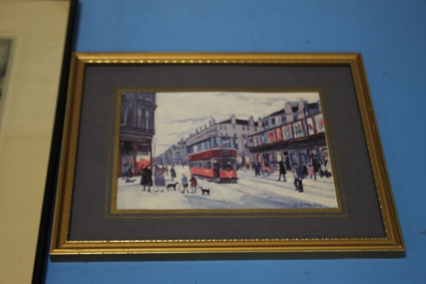 A PRINT OF A BETTY STIRLING PAINTING OF TRAMS TOGETHER WITH AN ETCHING OF CANTERBURY GATE BY ADRIAN HILL (2)
