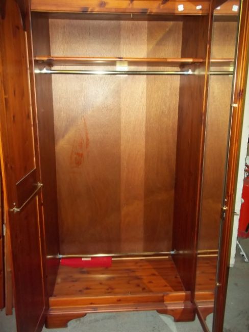 A SOLID PINE DUCAL WARDROBE AND A DOUBLE PINE BED FRAME, TOGETHER WITH A BEDSIDE CUPBOARD