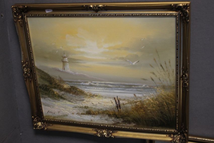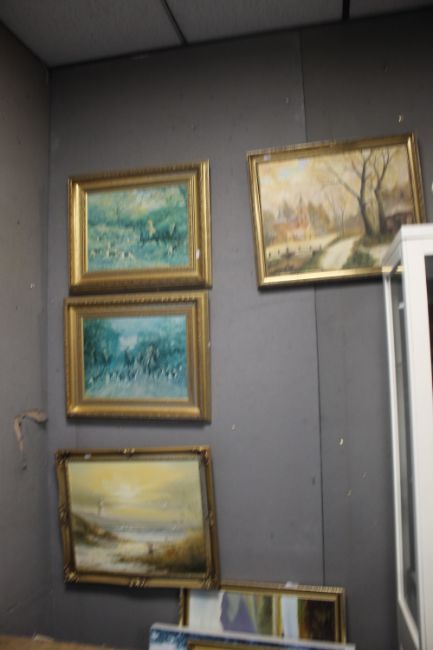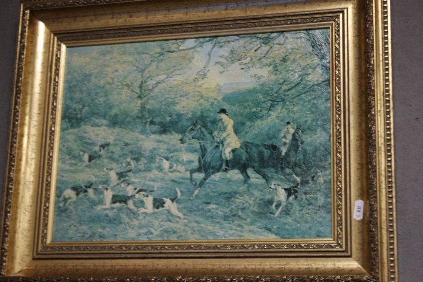TWO OILS ON BOARD LANDSCAPE PAINTINGS TOGETHER WITH TWO HUNTING PRINTS (4)