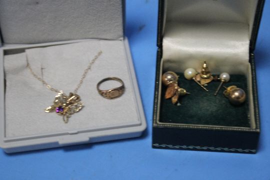 A CHILD'S 9 CT GOLD RING TOGETHER WITH A NECKLACE AND A QUANTITY OF EARRINGS, WEIGHABLE GOLD 2.1 g