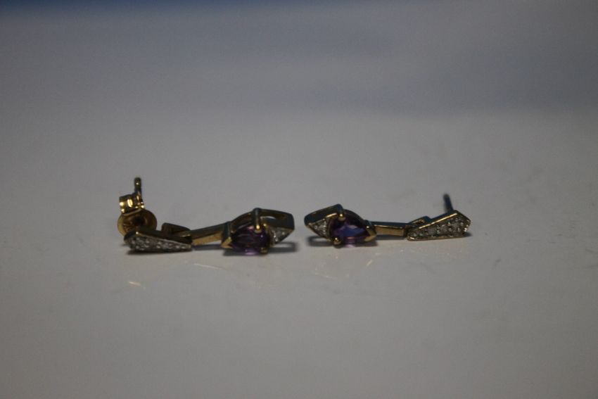 9 CT GOLD, AMETHYST AND DIAMOND DROP STUDS, ONE BUTTERFLY MISSING