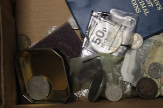 A QUANTITY OF ASSORTED COINS AND STAMPS