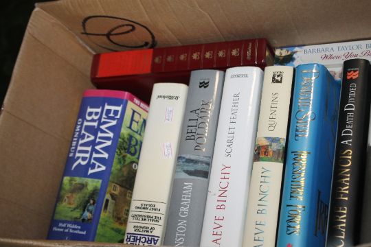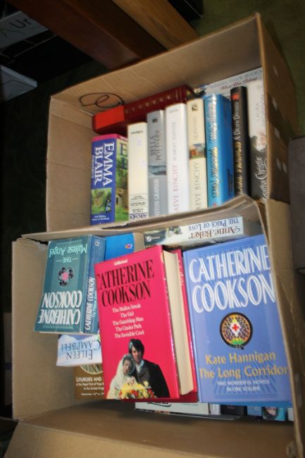 TWO BOXES OF NOVELS TO INCLUDE CATHERINE COOKSON, MAEVE BINCHY, AGATHA CHRISTIE ETC.