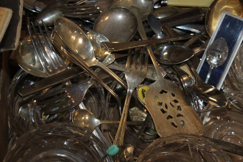 A TRAY OF GLASSWARE AND METALWARE (TRAY NOT INCLUDED)