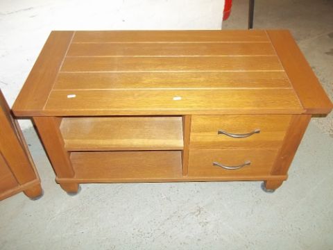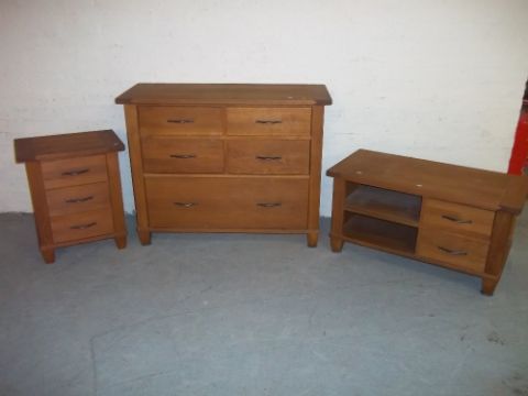AN OAK FIVE DRAWER CHEST OF DRAWERS (TWO OVER TWO OVER ONE), AN OAK MEDIA UNIT AND AN OAK THREE DRAWER CHEST