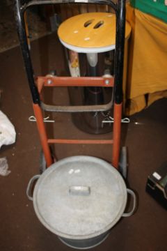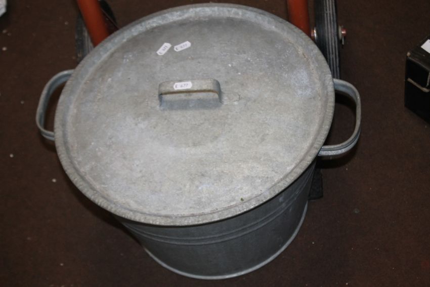 A SACK TROLLEY AND A GALVANISED LIDDED POT