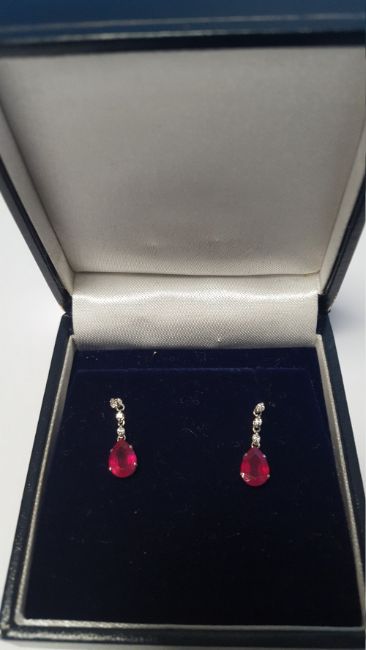 A PAIR OF 18 CT WHITE GOLD RUBY AND DIAMOND DROP EARRINGS WITH BUTTERFLY BACKS, RUBIES ARE 2.00 CT, DIAMONDS 0.08 CT, BOXED