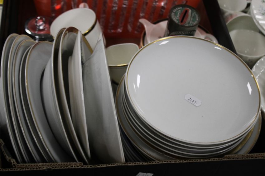 A TRAY OF MINTON TEA & DINNERWARE TOGETHER WITH OTHER CERAMICS INCLUDING TWO ROYAL WORCESTER TRINKET POTS AND GLASSWARE (TRAY NOT INCLUDED)