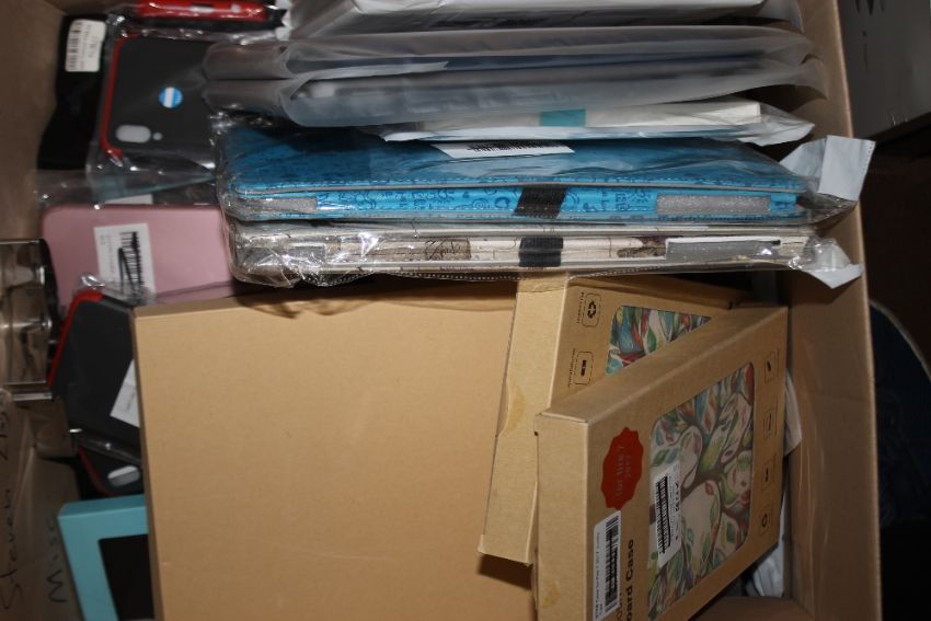 FOUR BOXES OF MAINLY NEW ITEMS TO INCLUDE WEDDING / PARTY TABLECLOTHS, TABLET CASES, PHONE CASES ETC.