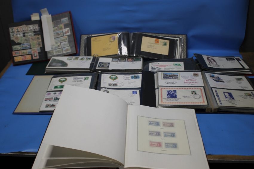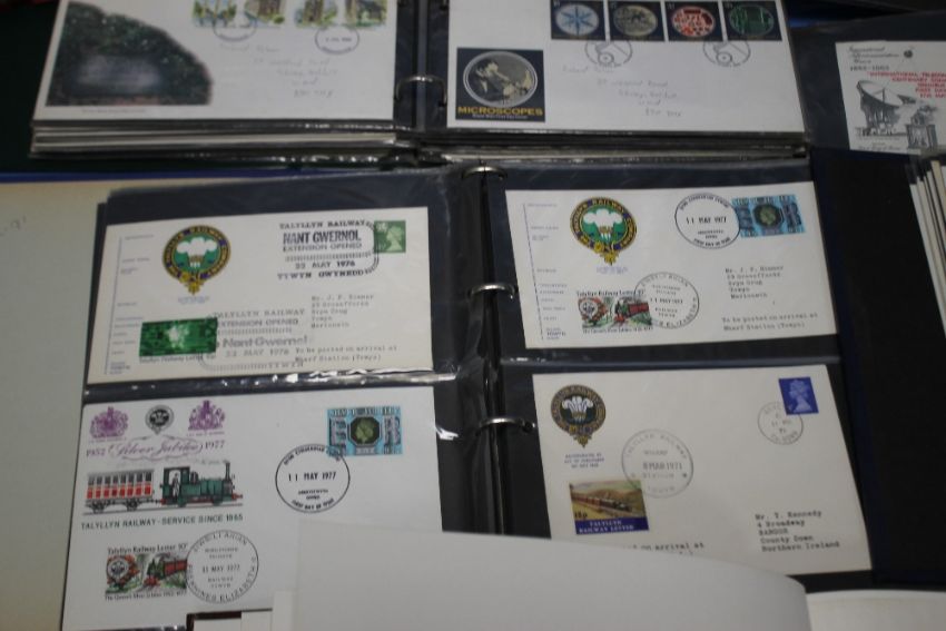 FIVE ALBUMS OF FIRST DAY AND COMMEMORATIVE COVERS, to include railway types and a selection from Iran (Approx 160). together with two albums of George VI Victory stamps