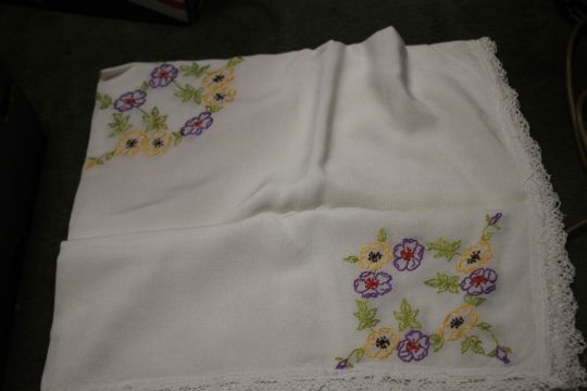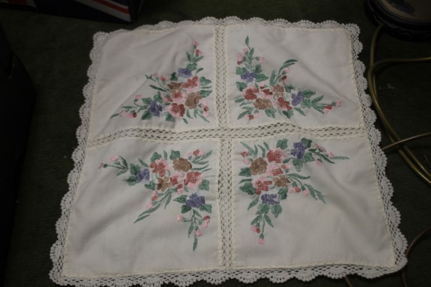 A TRAY OF LINEN INCLUDING EMBROIDERY