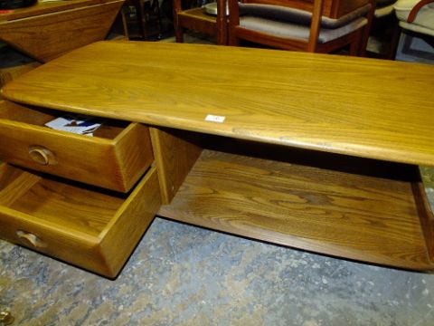 AN ERCOL WINDSOR LOW COFFEE TABLE WITH TWO DRAWERS H-40 W-51 L-121 CM