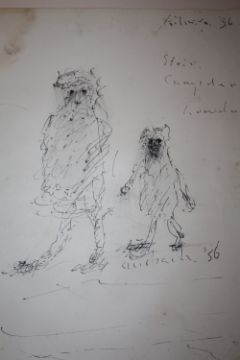 AN UNFRAMED MODERNIST PEN AND INK DRAWING ON PAPER STUDY OF TWO FIGURES INDISTINCTLY SIGNED SIZE - 36CM X 27CM