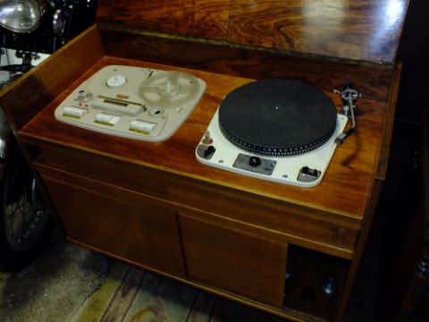A RETRO TEAK CASED ' GARRARD MODEL 301' RADIOGRAMME WITH STELLAPHONE REEL 2 REEL PLAYER H-80 W-95 CM
