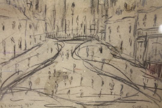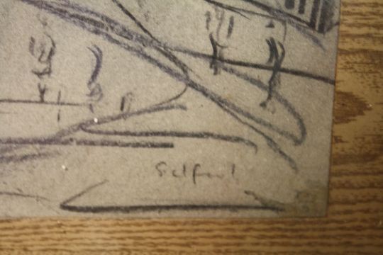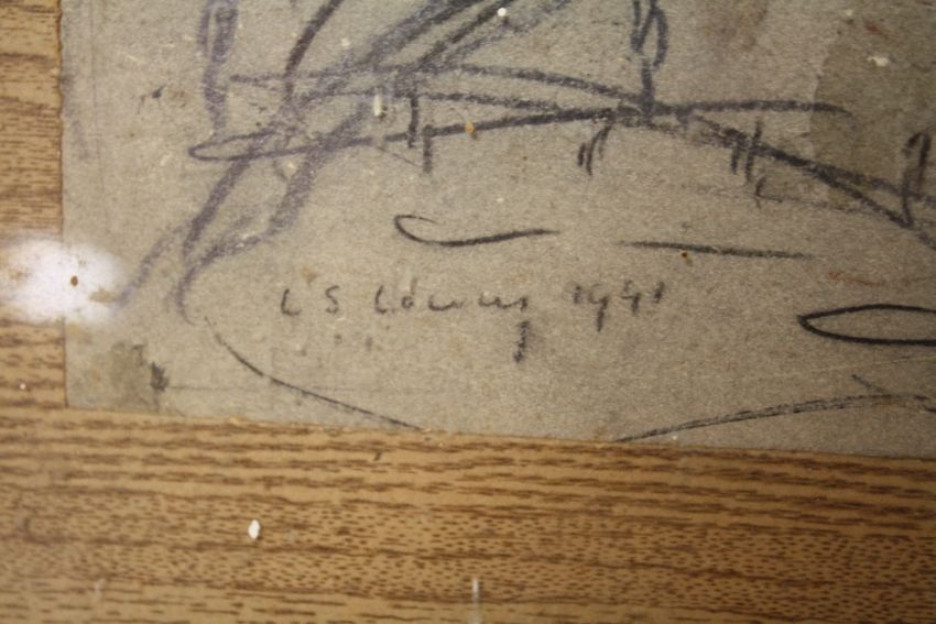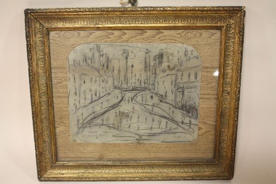 A CIRCLE OF LAURENCE STEPHEN LOWRY GILT FRAMED AND GLAZED PENCIL SKETCH OF A STREET SCENE ENTITLED 'SALFORD' 23CM X 18CM