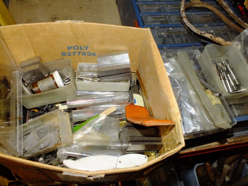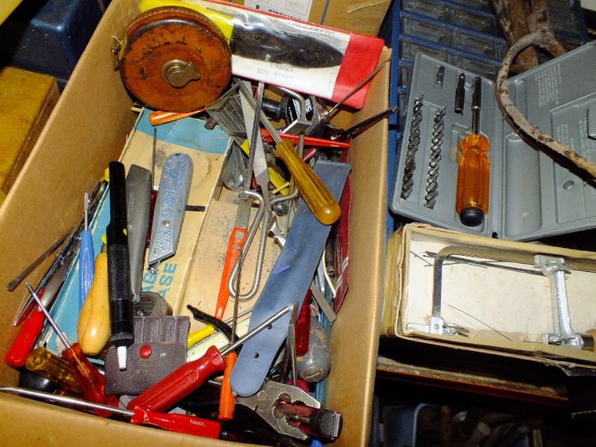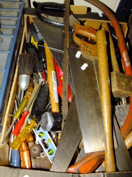 A TRAY OF MIXED HANDTOOLS PLUS TWO SMALL BOXES OF HANDTOOLS TOGETHER WITH A SMALL METAL STORAGE UNIT